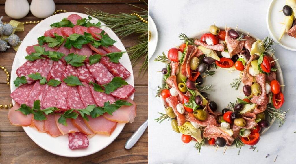 Мясные нарезки можно выложить в форме елочки или рождественского венка