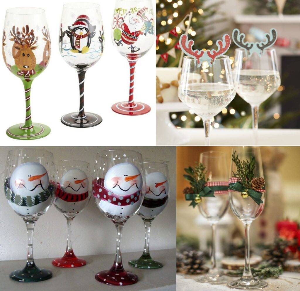 Бокалы к Новому Году можно разрисовать, декорировать лентами, шишками и веточками, а также бумажными декорациями