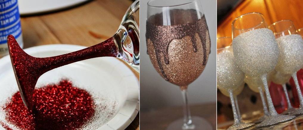 Праздничные бокалы можно задекорировать при помощи блесток. Нужно нанести клей ПВА и присыпать это место блестками.