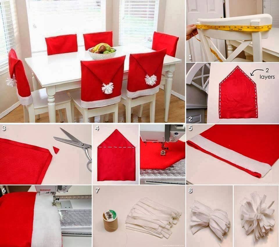 В тон скатерти можно изготовить чехлы для стульев. Следующий фотоколлаж иллюстрирует, как сделать такое оформление новогоднего стола самостоятельно. Чехлы-колпаки Санта-Клауса шьются не долго, зато приятно поразят ваших друзей.