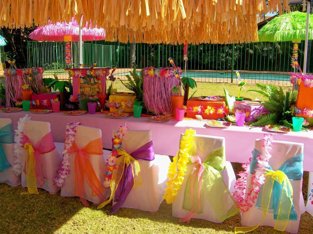 Ожерелья из ярких бумажных цветов, ракушек, стол, украшенный морскими звездами, использование посуды цвета лазури и столовый текстиль этого же тона создадут соответствующую атмосферу праздника у морского побережья. Замена чопорного фарфора на пластиковую посуду, использование половинок кокосового ореха в качестве посуды для напитков способны ввести в экстаз не только гостей и хозяев мероприятия, но и самого именинника.