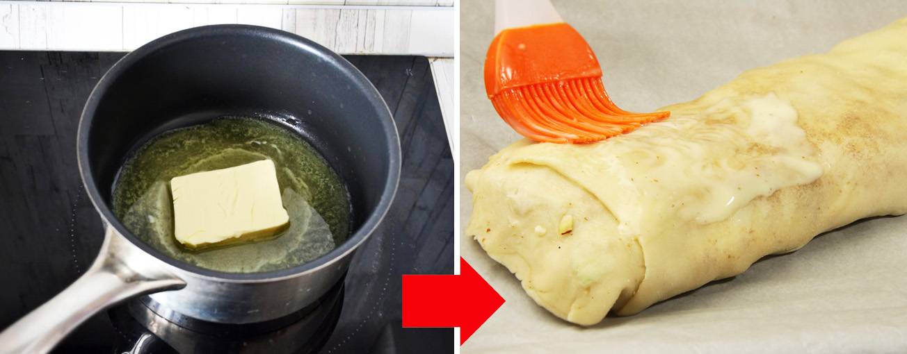В небольшой чашке растапливают кусок сливочного масла и смазывают им поверхность штруделя. В процессе выпечки это нужно делать примерно каждые 10 минут, так тесто получится мягким и хорошо пропечется.