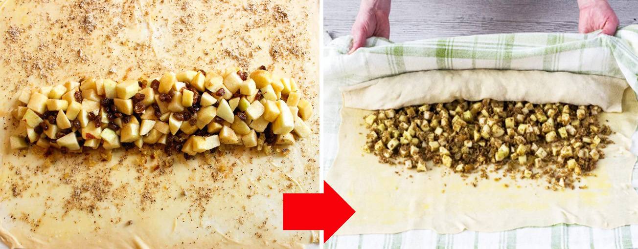 8. Начинку выкладываем вдоль короткого края. Скучиваем штрудель, защипывая края, так чтобы шов оказался внизу.