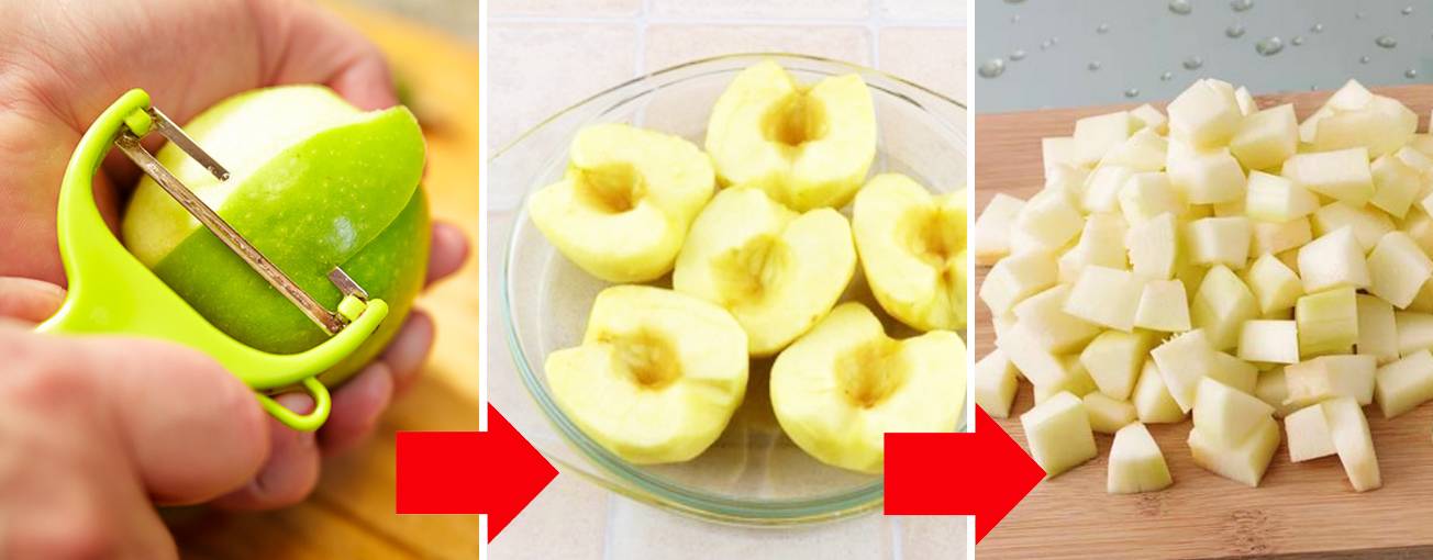- Яблоки почистить, помыть и нарезать небольшими кубиками (1×1 см).