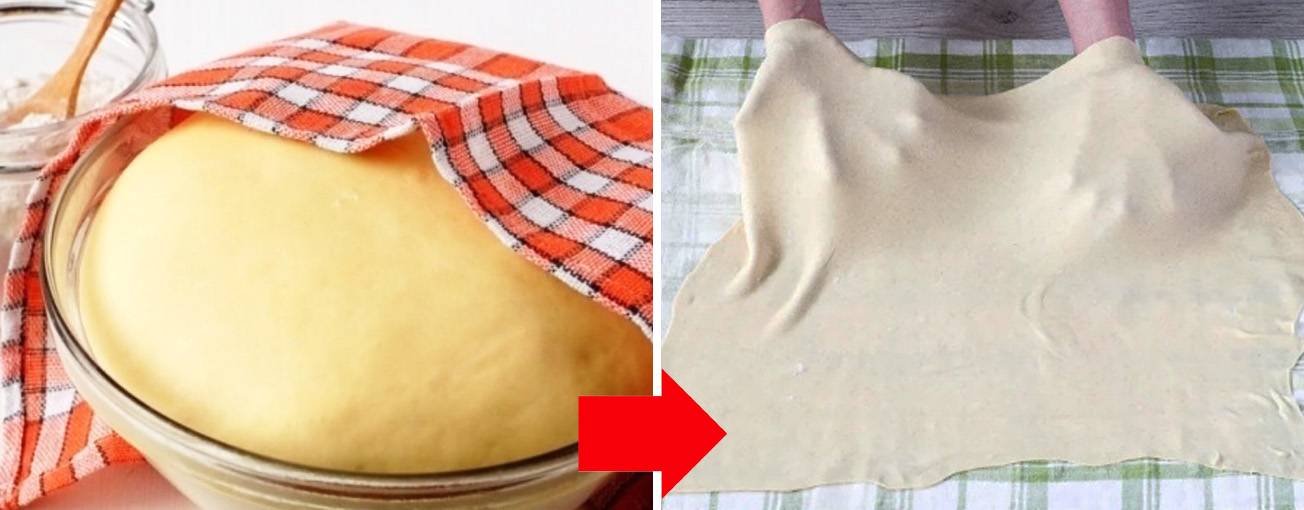 Из миски тесто выкладывается на полотенце, его постепенно начинают растягивать руками в разные стороны, пока толщина произвольного «круга» или «прямоугольника» не будет менее 0,5 см.