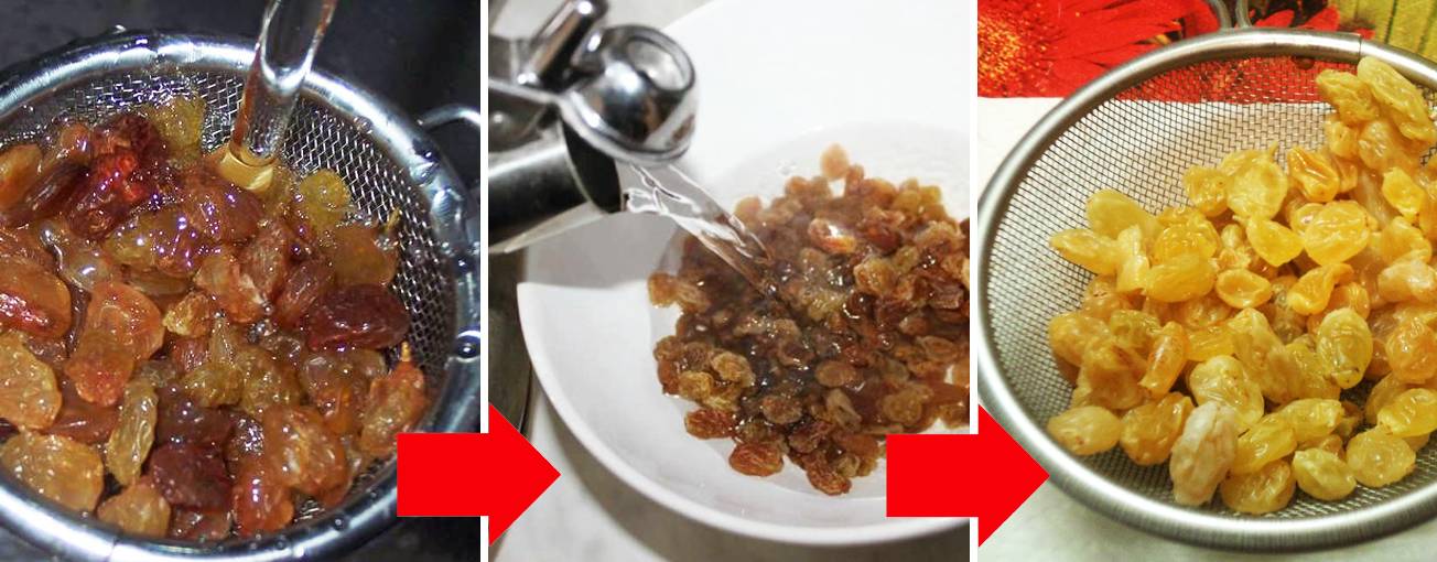 Изюм хорошенько промывается в дуршлаге, помещается в миску и на 10 мин. заливается горячей водой. Затем – вынимается и просушивается на бумажном полотенце.