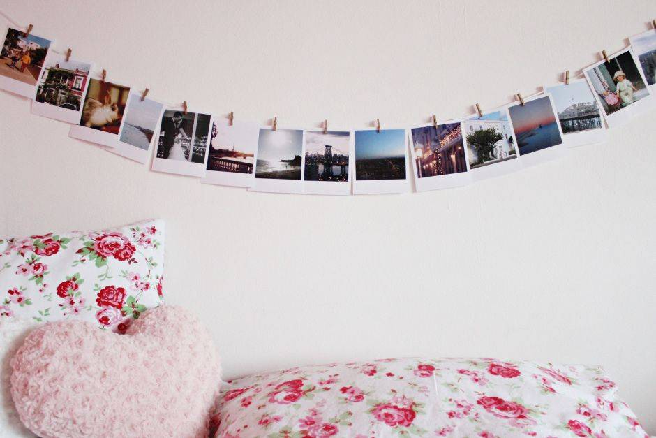 Основа коллажам из фото совсем не обязательна. Иногда достаточно выбрать небольшую стену, разместить на ней несколько крепких ниток или лесок, на которые разномастными прищепками закрепляются самые любимые картинки.