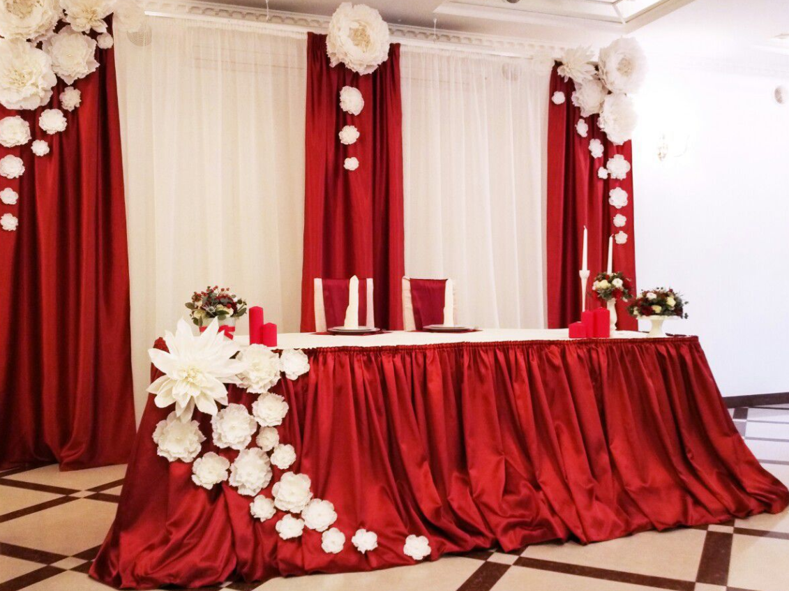 В зале, где будет проходить банкет, должно быть больше света. Преобразить его поможет декорирование столов, стульев, фотозоны и чайного стола тканью. Для президиума – стола, где будут сидеть молодожены, для столов гостей можно сделать декоративные «юбки». На белые скатерти могут быть дополнительно положены красные салфетки. Для стульев можно сделать белые чехлы и оформить спинки красными бантами.