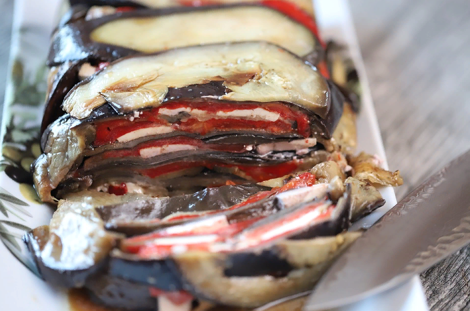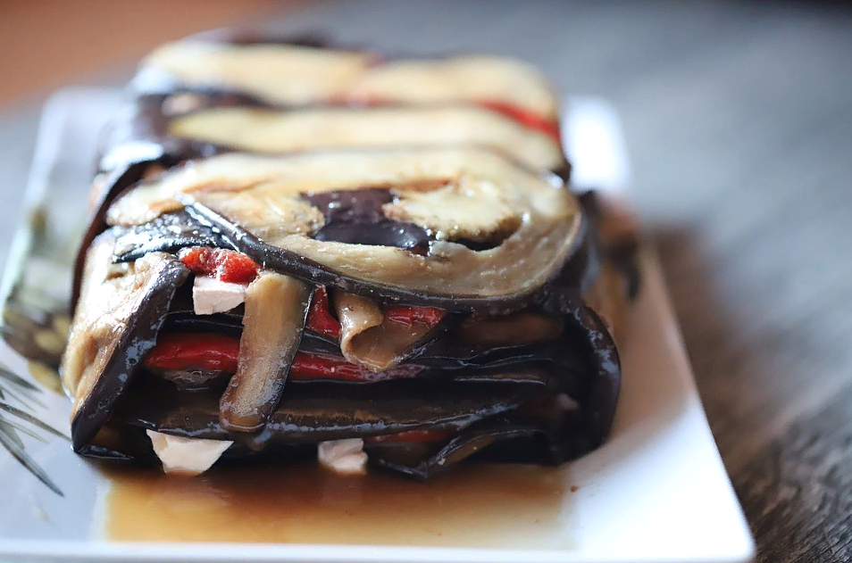 Закусочный рулет из запеченных перцев и баклажанов с сыром «Фета»