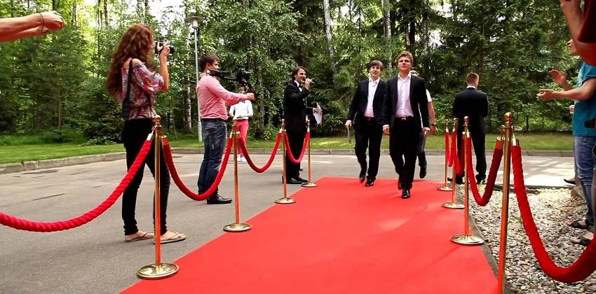 Красная дорожка, вспышки фотоаппаратов, столбики с канатами,