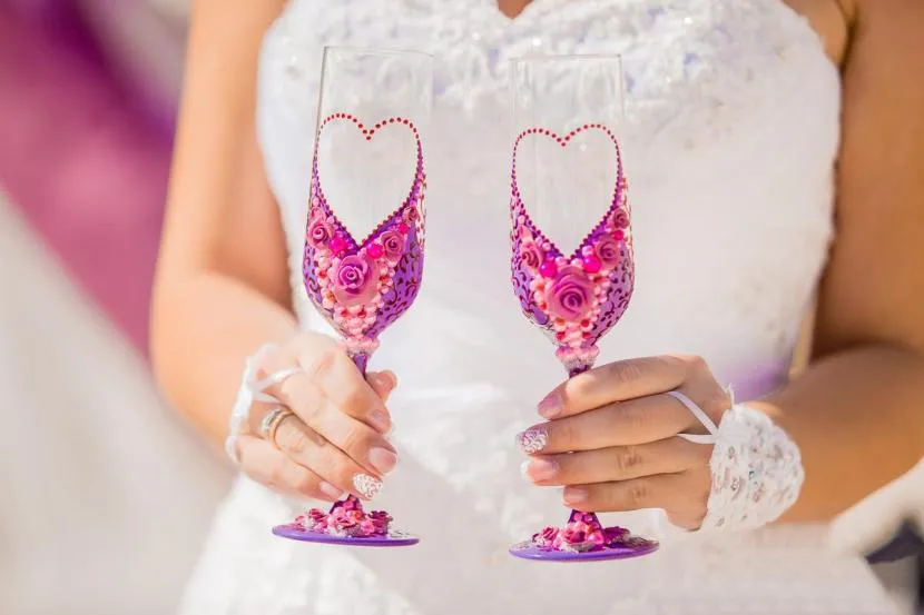 Каждая из этих техник уникальна и позволяет оформить праздничные фужеры в соответствии с предпочтениями молодоженов и общим стилевым направлением всего торжества. Главное, увлекшись декорированием, не забывать о непосредственном предназначении сосудов. Используемые декоративные элементы не должны мешать пить из бокалов и обязательно должны быть безвредными для здоровья.