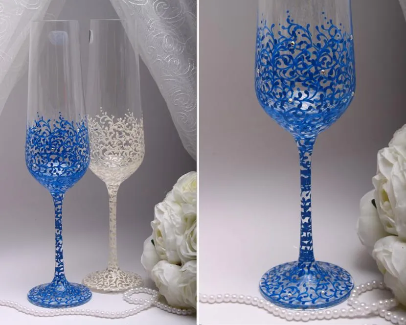 Для того, чтобы оставить собственную роспись на бокалах, нигде учиться не надо. Несколько тренировок накануне свадьбы позволяют быстро освоить скрупулезное ремесло. При выполнении работ нужно позаботиться о чистоте бокалов. Несмотря на широкий выбор, наибольшей популярностью пользуются насыщенные акриловые краски. Перед нанесением ее на поверхность стеклянного изделия, последнее обезжиривается. Благодаря тщательной подготовке атрибута праздничного стола, мастерица осуществляет прорисовку изысканных рисунков с ажурными элементами. Впоследствии изделие покрывается акриловым лаком.