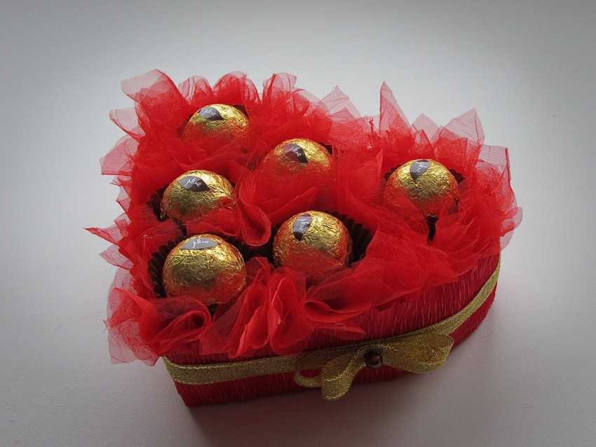 Ко дню святого Валентина стоит подготовить особый подарок – букет из роз с конфетами. Лучше его сделать в форме сердца – символа любви. Такой презент подойдет как для девушки, так и парня, сделать его легко так: