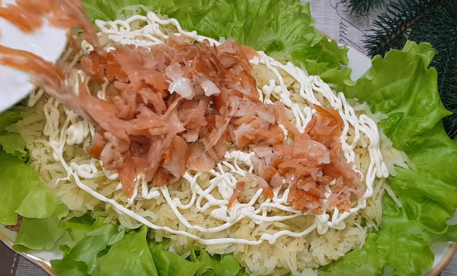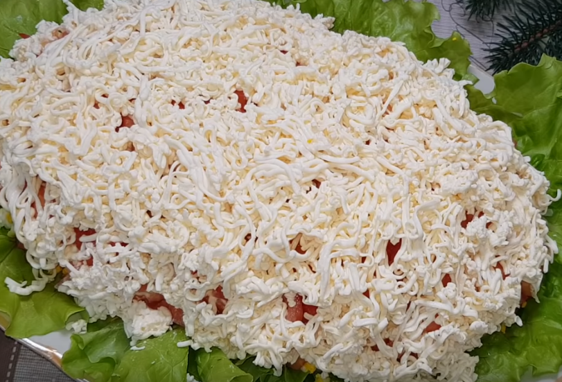 - Последний слой – морковку разложить, обмазать майонезом, сверху посыпаем сыром, потертым на средней терке.