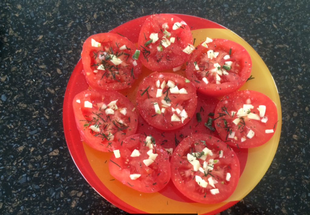 Самая простая и быстрая закуска для гостей. Помидоры нарезаем кружочками. Мелко нарезаем чеснок и укроп. Немного сбрызгиваем соком лимона или уксусом, солим, перчим и посыпаем чесноком и укропом.