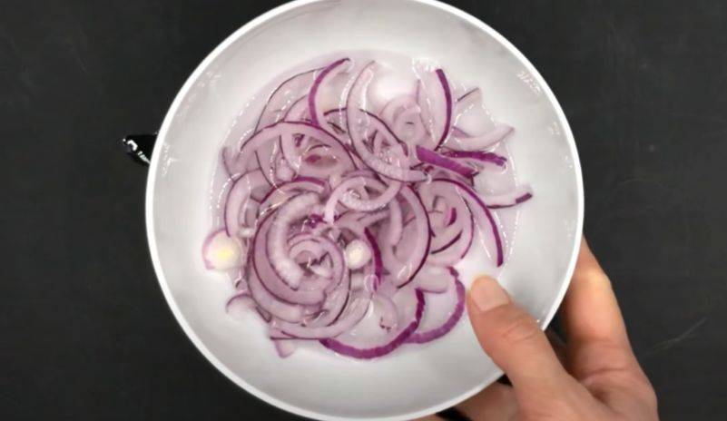 1.Луковицу нарежьте полукольцами, сложите в глубокую мисочку. Налейте 100 г холодной воды, добавьте сахар и столовый уксус. Перемешайте и пока отставьте в сторону мариноваться.