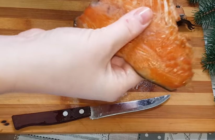 Для салата используются хребты горячего копчения, поэтому салат по стоимости выйдет намного дешевле. Вкус готового блюда от этого не изменится. Отделить мясо рыбы от костей.
