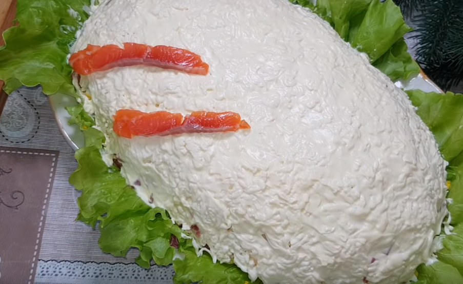 - Яйца, натереть на мелкой терке, распределяем по поверхности, обмазать майонезом – четвертый слой.