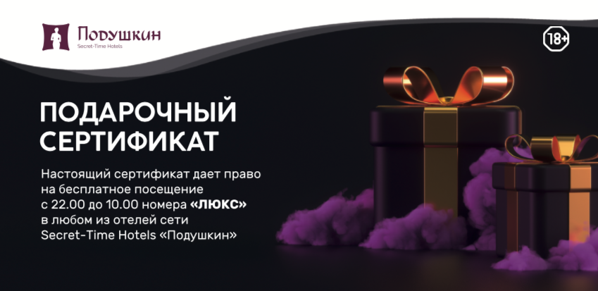 Совершенно не важно, на какой праздник будет подарок: на день рождения, Новый год, годовщину, свадьбу или по любому другому поводу! Эмоции это то, что не будет пылиться на полке или сразу потеряется. Мы предлагаем, в качестве идеи для подарка любимым, друзьям, молодоженам, или даже начальнику, сертификат на посещение Secret-Time Hotels “Подушкин”