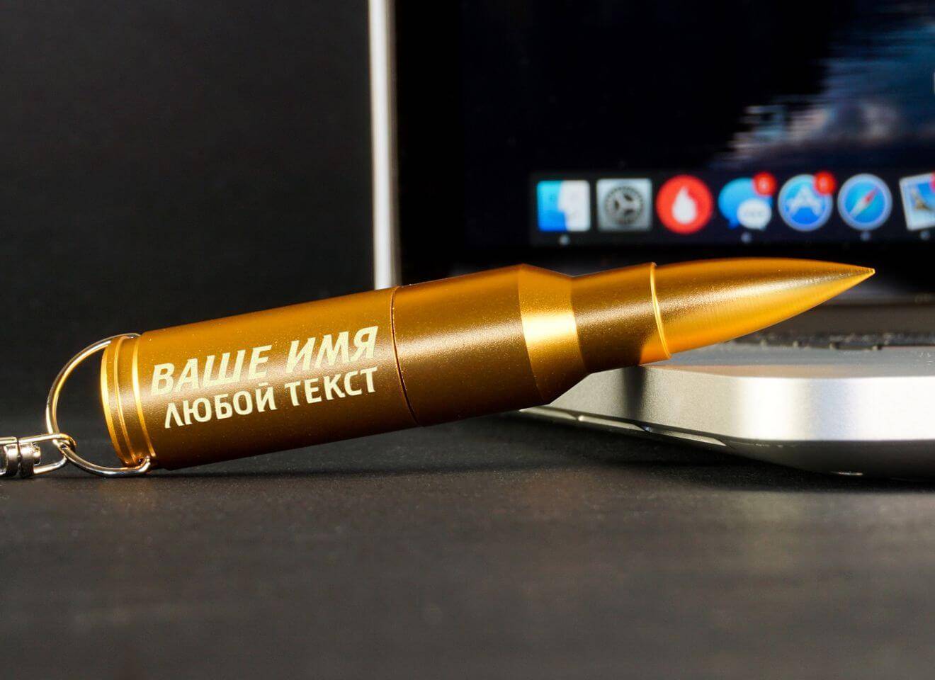 - Флешка оригинальной формы с большим объемом памяти. Такая флешка может быть выполнена, например, в виде патрона или пул.