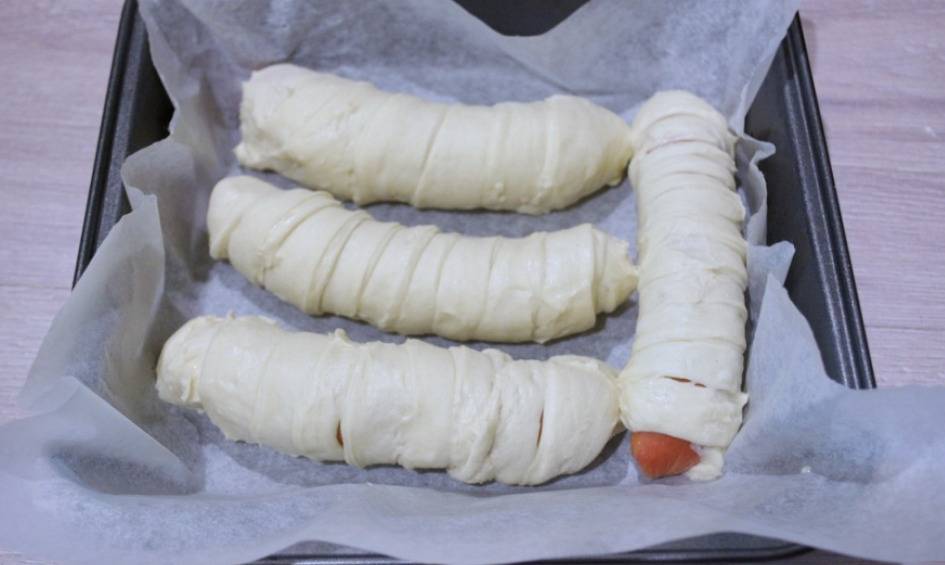 Каждую сосиску закатывают в полоску, выкладывают на смазанный противень и отправляют в разогретый до 180° духовой шкаф. Спустя 5 минут их покрывают желтком и запекают еще 20 минут.