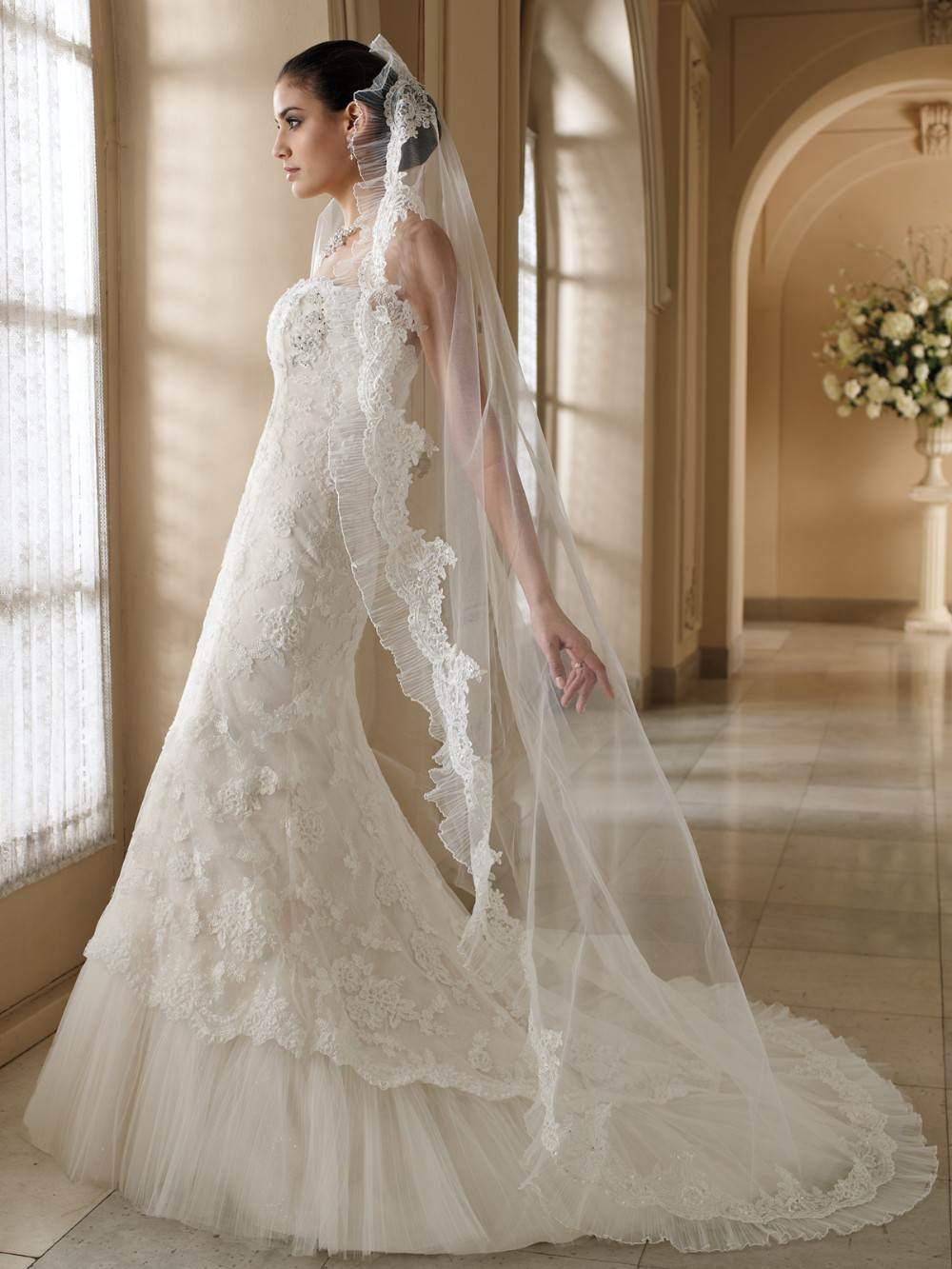 строгое, классическое свадебное платье хорошо сочетается с фатой с богатой, детальной отделкой