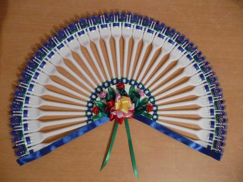 В основание каждой вилочки, для шарма, и чтоб прикрыть заложенные складки, хорошо вклеить искусственную розочку. На ленты и кружево можно наклеить стразы, а основание веера задекорировать розочками.