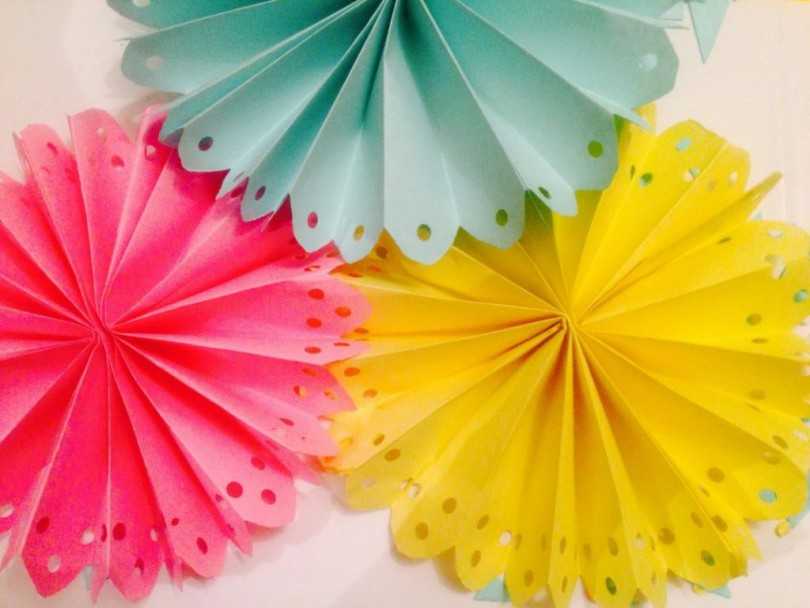 Декорировать веерные кругами из бумаги помещение комнаты довольно просто, главное, подобрать сочетающиеся оттенки, соответствующие общему интерьеру комнаты. Они украсят любое торжество или детский праздник. Развесить поделки можно на стенах комнаты, на окнах либо под потолком на ниточках. Лучше всего смотрятся детали на светлом фоне.