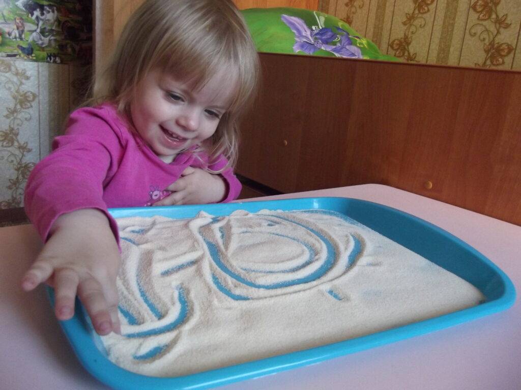 Насыпьте муку или манку ровным слоем на подносе и рисуйте! С детьми 2-3 лет можно писать цифры и буквы.
