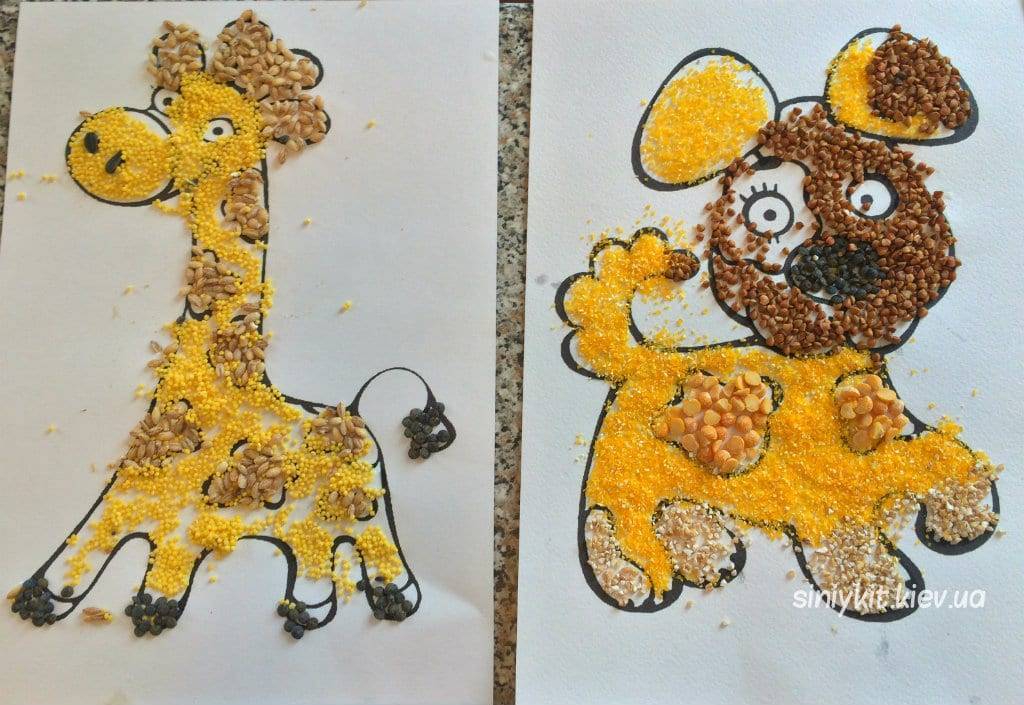 Распечатайте раскраски для малышей, нанесите на них клеи и посыпьте крупы. Можно использовать несколько видов круп.