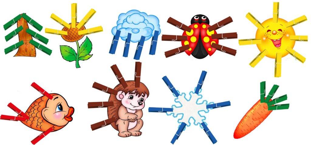 Очень эффективная развивающая игра с прищепками. Делайте лучики солнца, капельки тучки, лепестки цветов, иголки у елки, хвостики у рыбки итд.