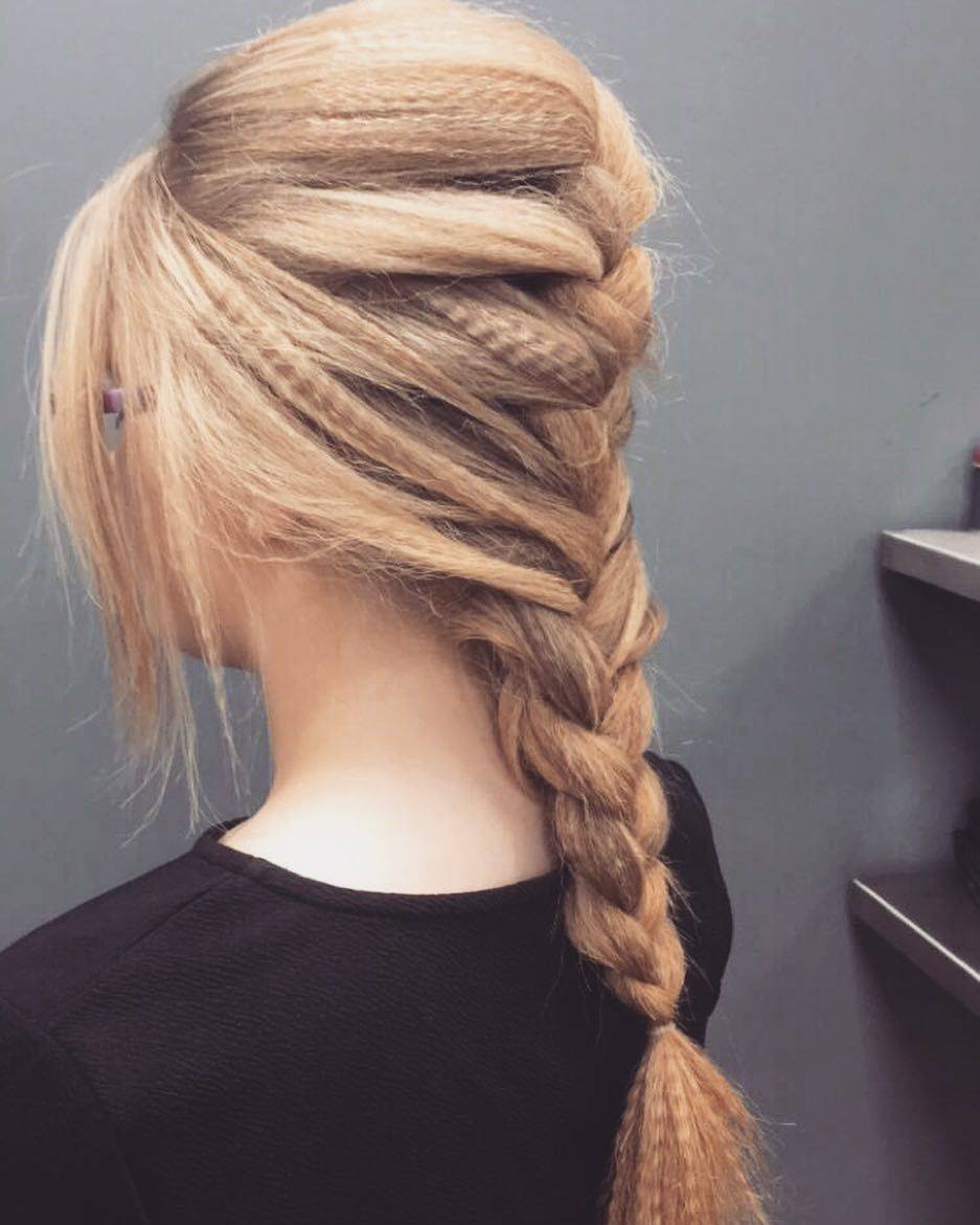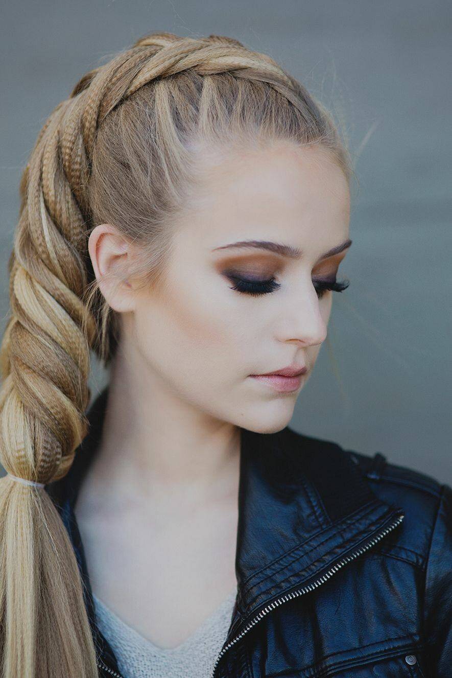 - Хвост разделите на две равные части и заплетите косу, перекидывая поочередно тонкие прядки волос с одной стороны на другую. Закрепите косу тонкой резинкой.
