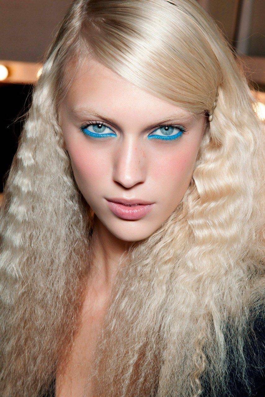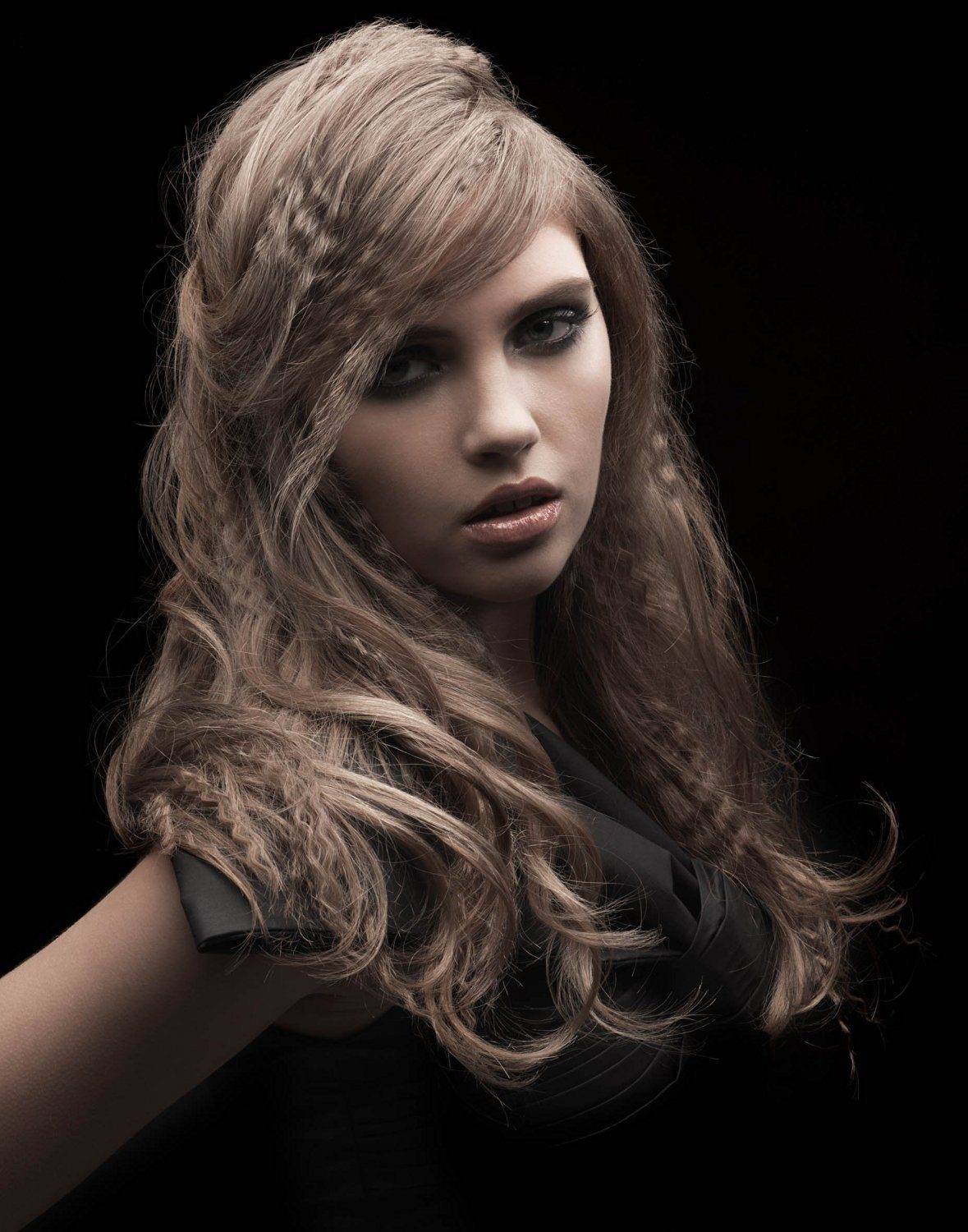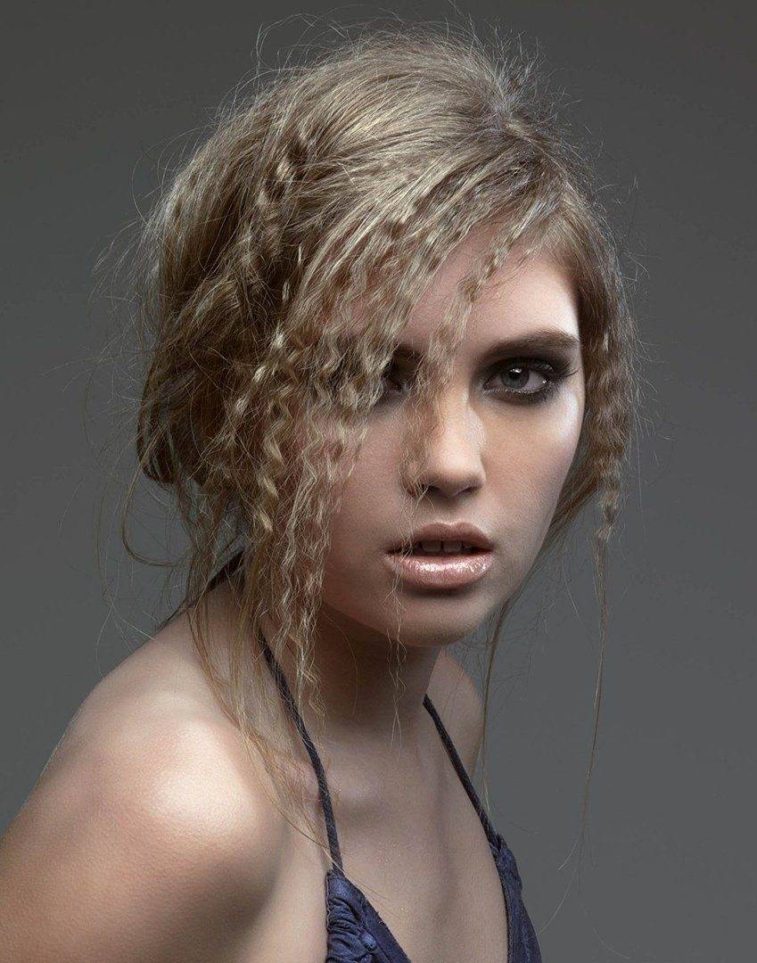 10. Видимая небрежность. Слегка или сильно подвиваем пряди плойкой, затем поднимаем их у корней диффузором. Поправляем пальцами, челку укладываем набок или назад.