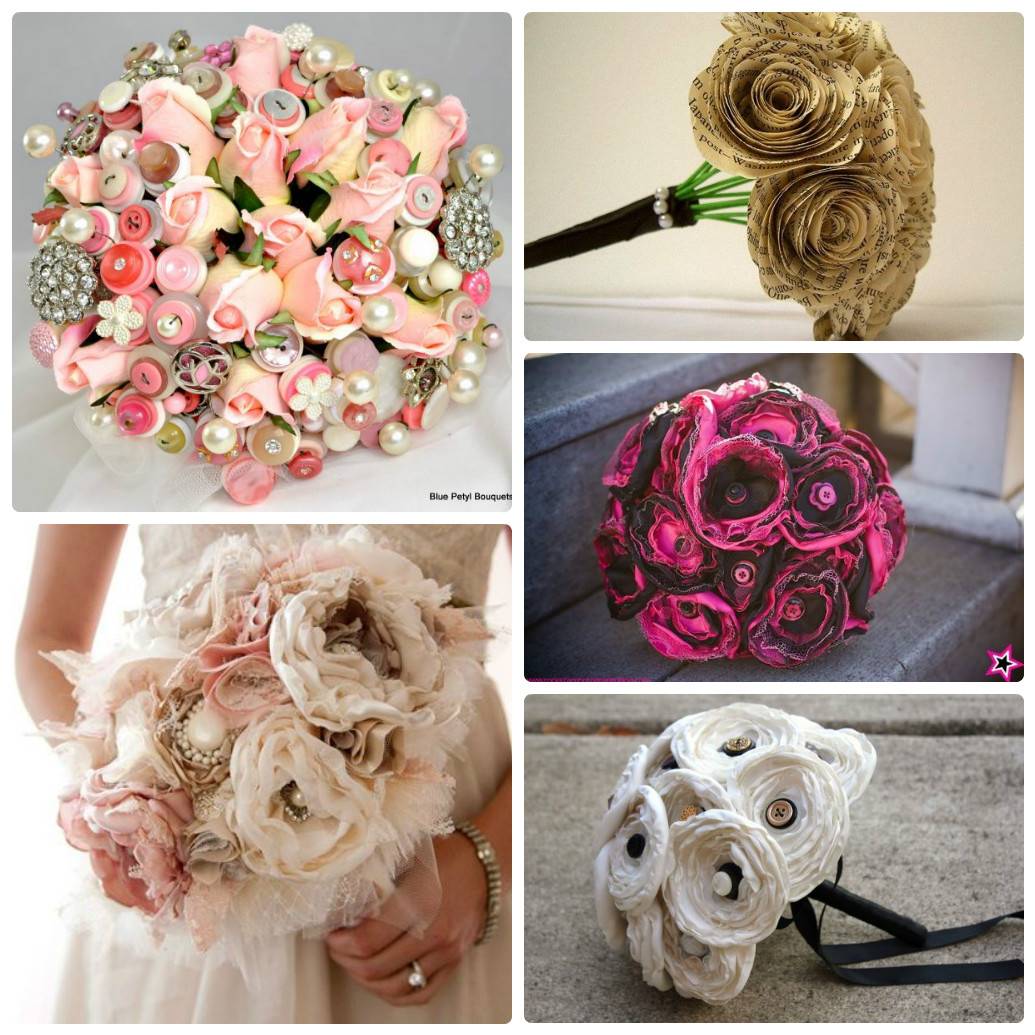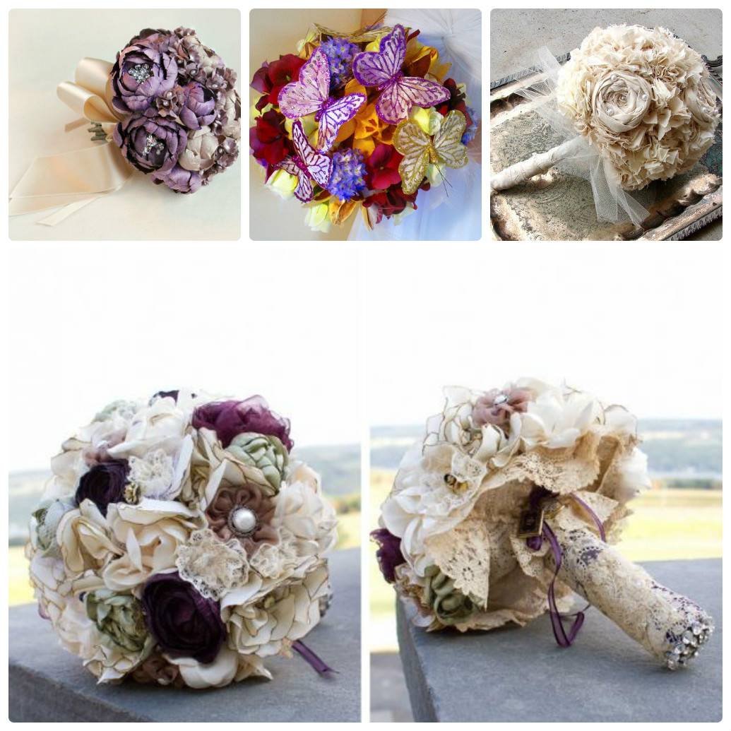 В зависимости от темы свадьбы, невеста может выбрать букет, который будет составлен из соответствующих элементов — кнопок, зубчатых колес, фигурок животных, бабочек, ракушек. Сшитый из материала, «приправленный» дополнительными элементами, такой букет может стать настоящим шедевром!