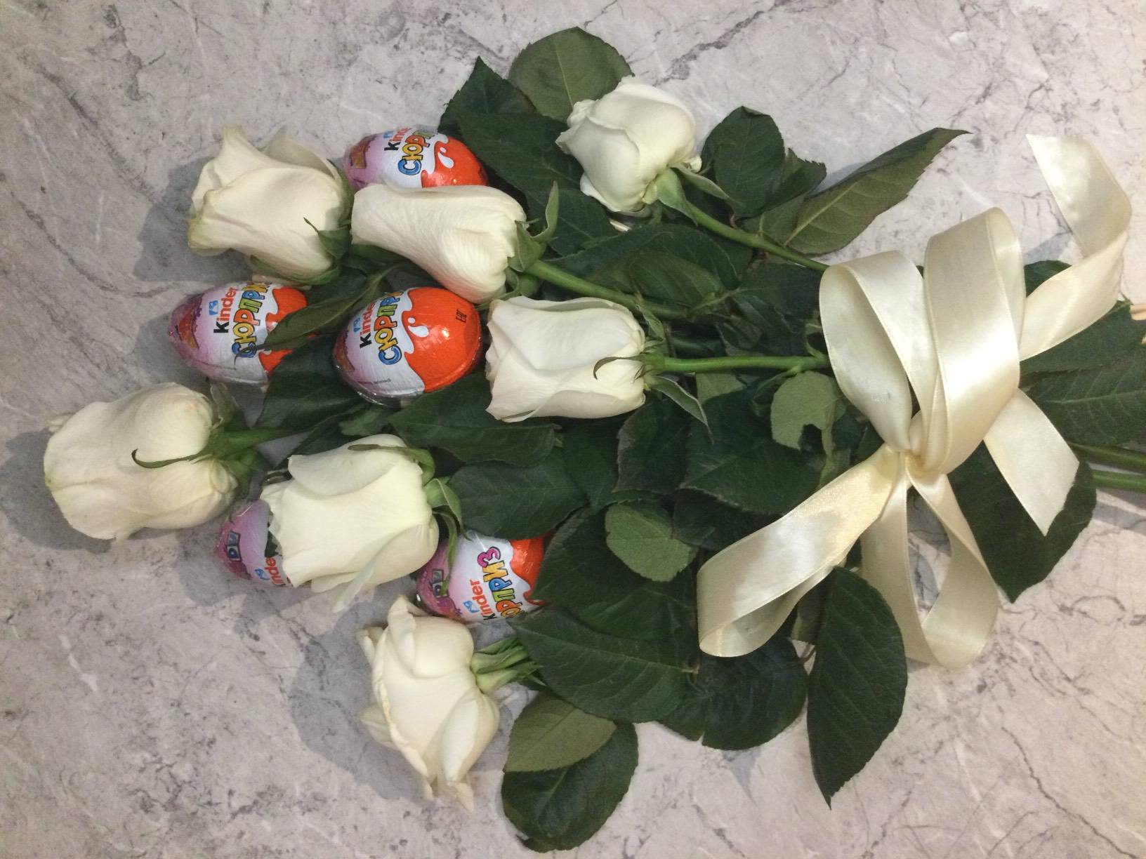 Расправляем фунтики, гармонично располагаем все детали. Радуемся великолепному результату! А можно составить букет из киндер-сюрпризов и живых цветов!