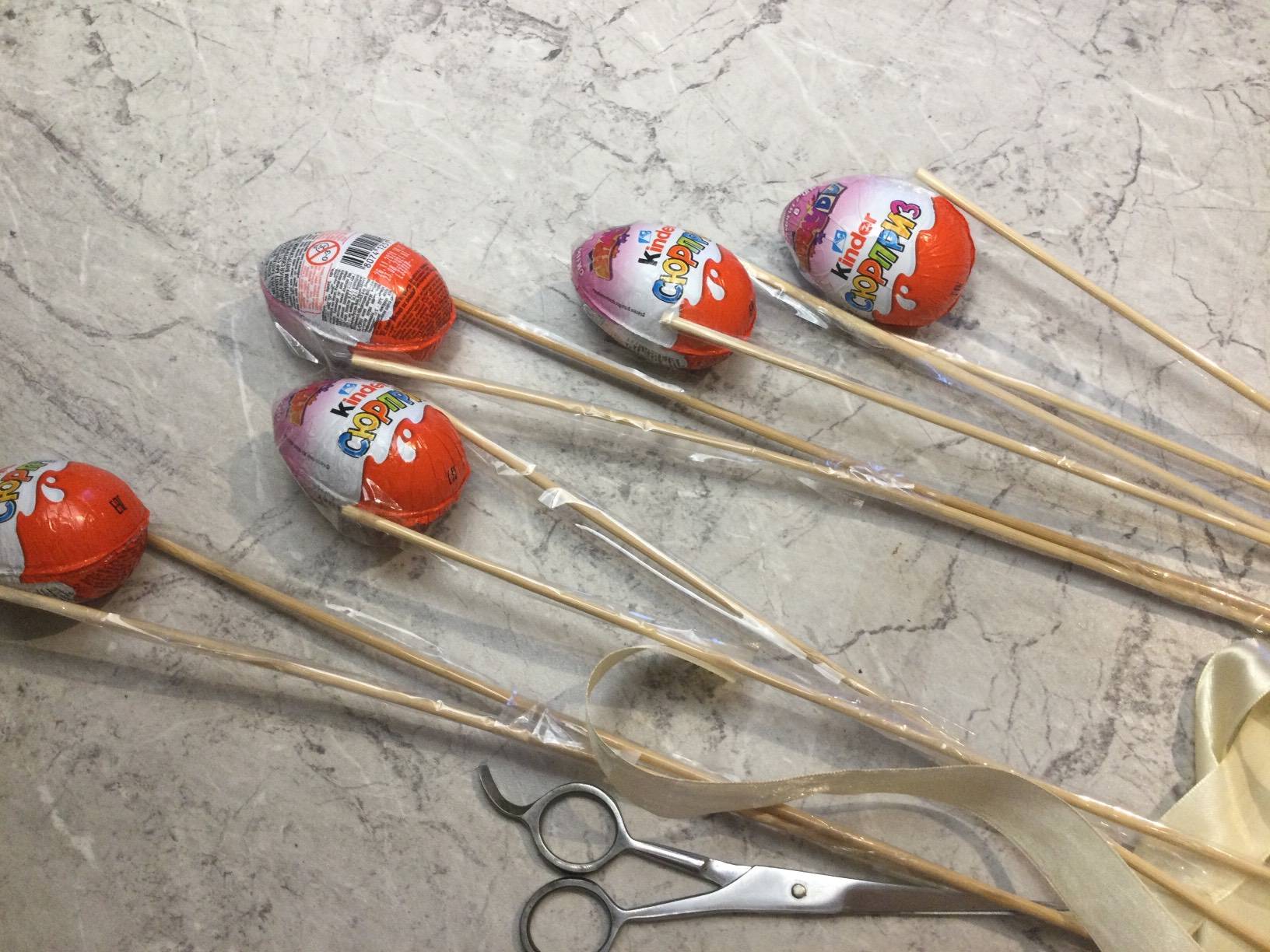 Чтобы сделать букет из киндер, приобретем заранее и соберем на рабочем столе для мастер класса: