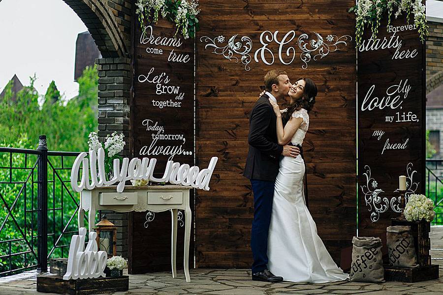 Самый распространенный вариант фотозоны на свадьбе. Простыми словами, это стена, создающая фон для снимков — как в профессиональной студии, только интереснее. Прелесть такого варианта заключается в том, что оформить такую зону можно как угодно! Все зависит от вашей фантазии и личных предпочтений.