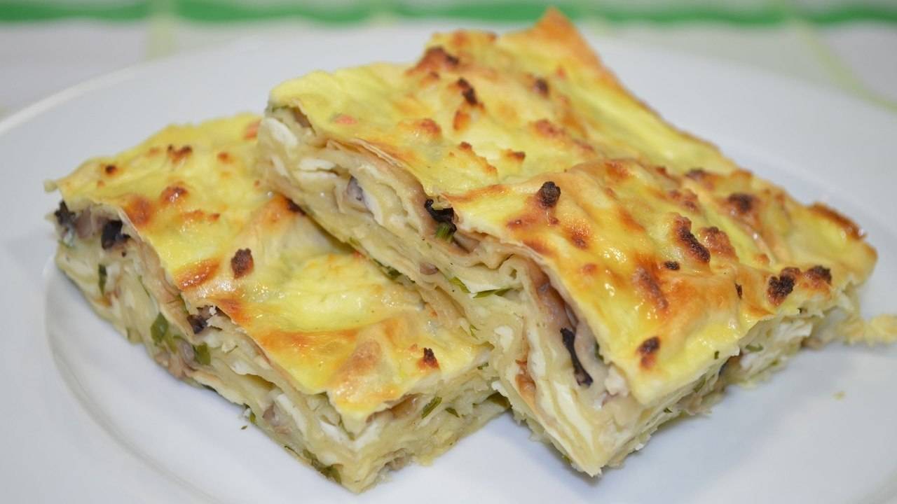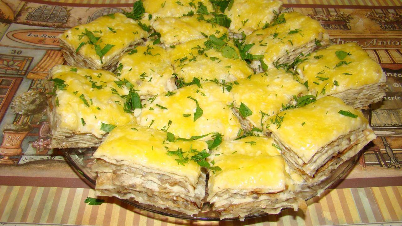 Блинные мешочки. Оригинальное блюдо не сложно сделать из готовых блинчиков. Для приготовления возьмем блинчик, положим в центр начинку и соберем его в виде мешочка-узелка. Для того чтобы блин не распался, зафиксируем узелок полоской от сыра-косички или с помощью зеленого лука.