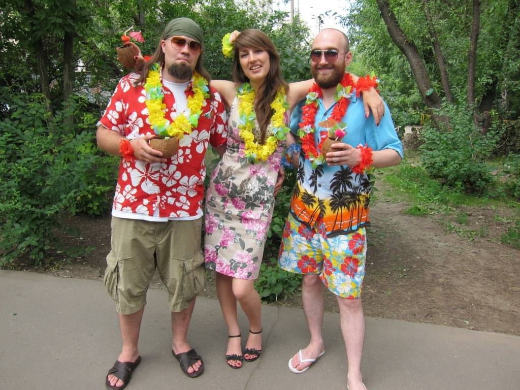 Одежду нужно подбирать исходя из двух принципов: яркость и лёгкость. Понадобятся аксессуары, которые соответствуют духу: цветы, леи, соломенные шляпы и т.д.