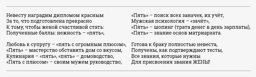 Свидетельство о подготовке к семейной жизни. В него можно включить перечень умений новобрачной, необходимых для замужней жизни. Здесь допустимы и нейтральные «дисциплины» (ведение домашнего хозяйства, воспитание детей), и шуточные (теория скандалов, стрельба глазами, угождение свекрови).