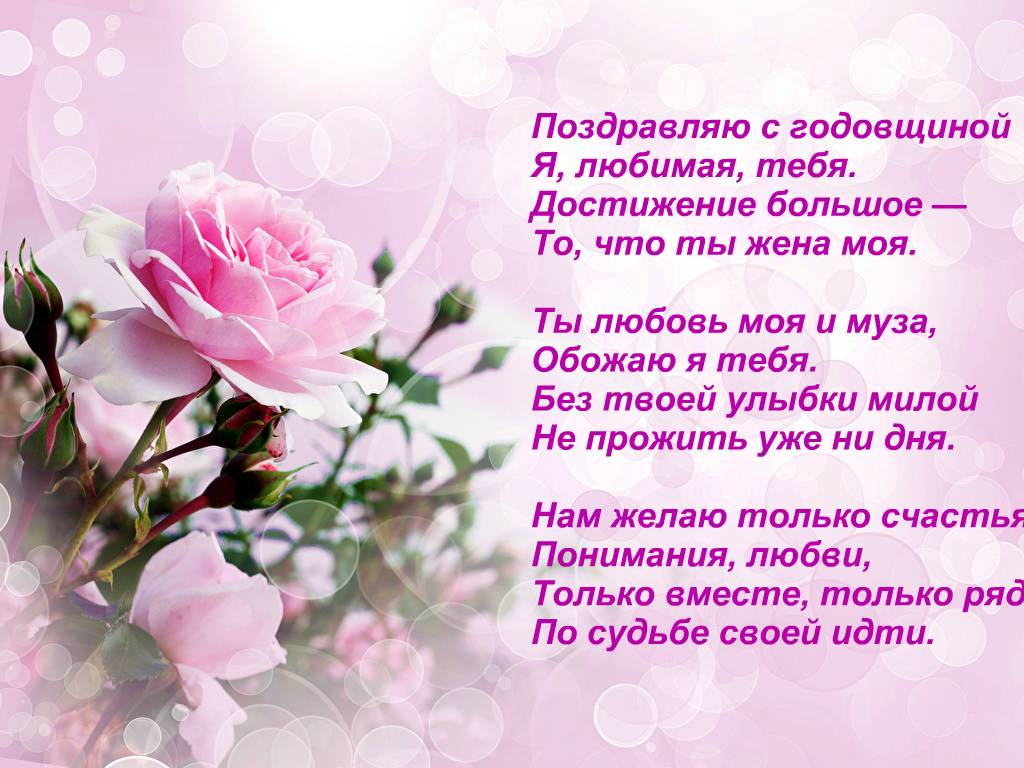 - Ты та, которую я искал всю жизнь. Ты мое солнце, ты моя луна. И как невозможно жить без солнца и луны, так и я не представляю себя без тебя. С годовщиной моя дорогая и самая любимая!Ты моя самая ценная и самая дорогая сердцу жена. Я самый счастливый человек на земле, у меня есть такое сокровище, как ты. Желаю тебе моя звездочка, удачи и успехов во всех делах. С годовщиной!