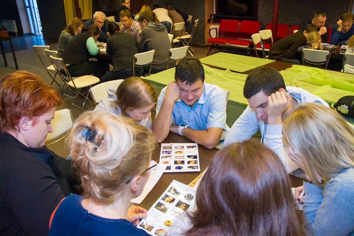 Очень веселый и комфортный формат. Все участники сидят за банкетными столами по 4-8 человек. Один стол — одна команда. Все находятся рядом, но при этом команды играют друг против друга. Высокая вовлеченность, азарт, много юмора и радость победы, которую игроки чувствуют после каждого «взятого» вопроса.