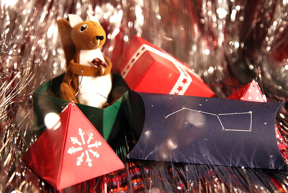 3. Украсить коробочку (а заодно скрыть лишние сгибы на крышке) можно с помощью лент (набор из пяти атласных лент с новогодними принтами обошелся нам примерно в 150 р.). Совет для перфекционистов: чтобы спрятать края, проденьте их в прорези в крышке (вы легко поймете, где их сделать) и прихватите со внутренней стороны клеем-карандашом. Не забудьте немного ослабить натяжение лент, чтобы крышку можно было согнуть.