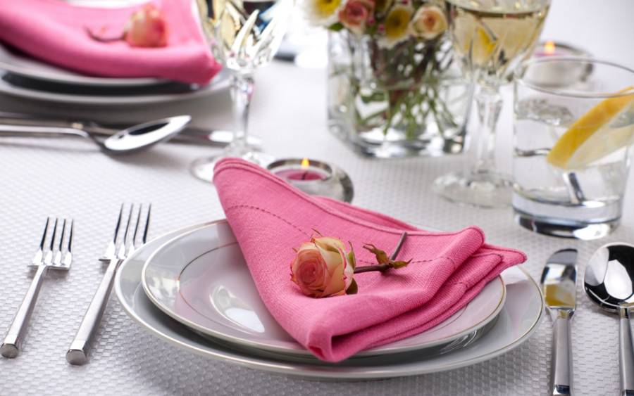 Не обязательно брать обычные белые салфетки, ведь это все же праздник, и можно воспользоваться красивыми художественными цветными салфетками. Каких-то особых правил для расстановки салфеток не существует. Они могут находиться под приборами, в стакане для воды или можно сделать из них какую-то интересную фигурку.