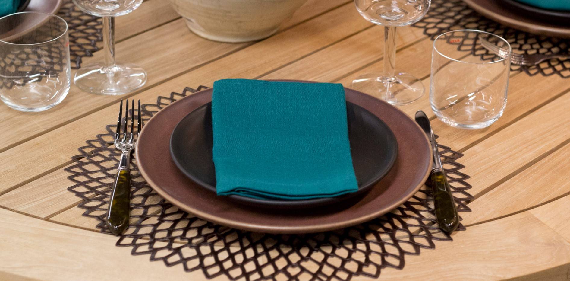 Можно подобрать салфетки, которые темнее на несколько тонов по отношению к скатерти. Также можно использовать салфетки в качестве акцентированного элемента, например, разместив ультрамариновые изделия на белой скатерти.