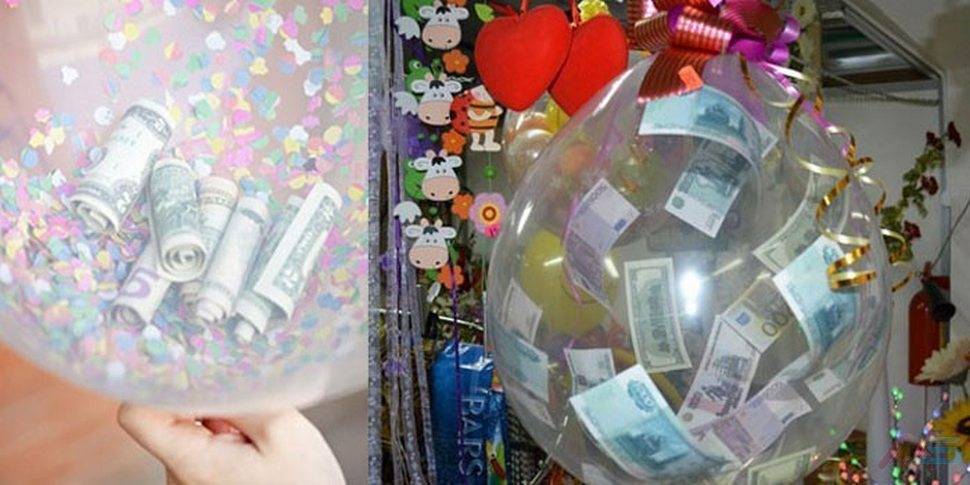 Вариант первый: Вы покупаете большую коробку и гелиевые шары. К кончику шаров привязываются купюры и вся эта конструкция упаковывается в коробку. Когда молодожены открывают ее, вверх взлетают шарики и купюры. Удивление и восторг непередаваемы.