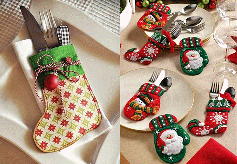 Приборы размещают в праздничных рукавичках, носочках или просто перевязывают лентой. Скатерть может быть белоснежной или с мелким рисунком, чтобы посуда выделялась ярким акцентом. Модно поверх светлой скатерти, вдоль стола, поместить полоску яркой ткани.