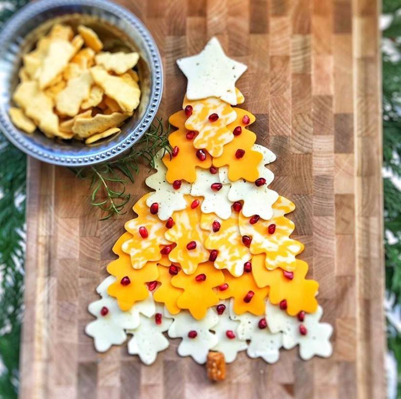 Нарезку из овощей, сыра и колбаски можно оформить в виде елочек