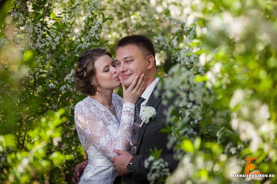 - в руке невесты свадебный букет, а жених ее бережно поддерживает;