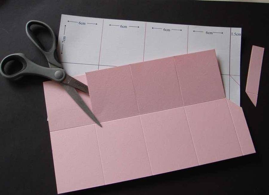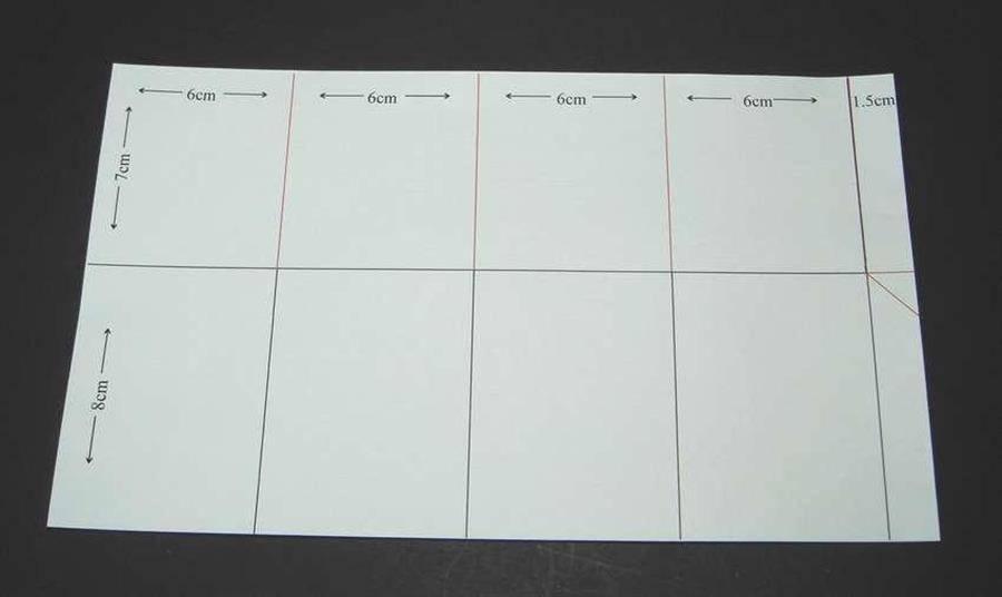 Чтобы сделать такую коробочку, нам нужно прежде всего расчертить альбомный лист на прямоугольники размером 6 на 7 сантиметров. Справа необходимо оставить место для полосы шириной в 1,5 сантиметра и нанести следующие линии: